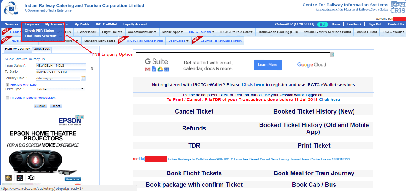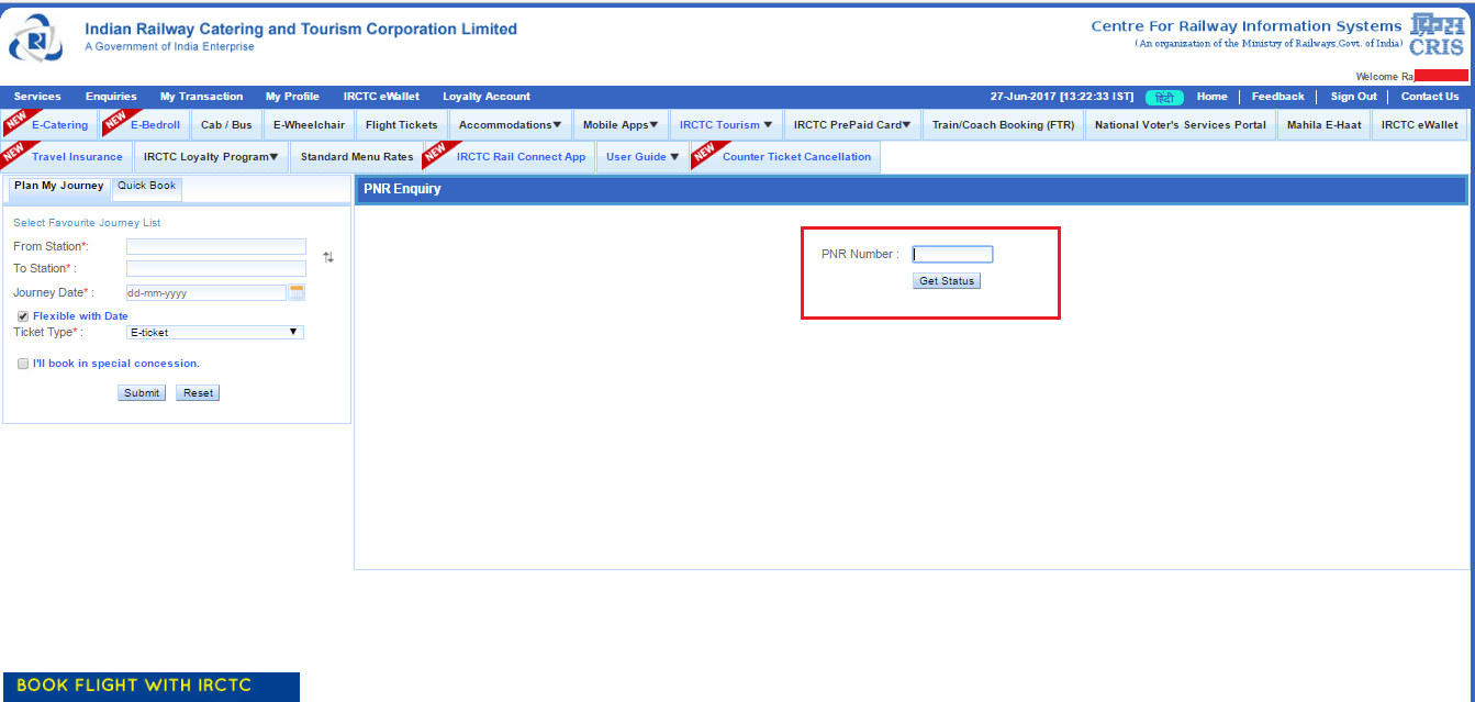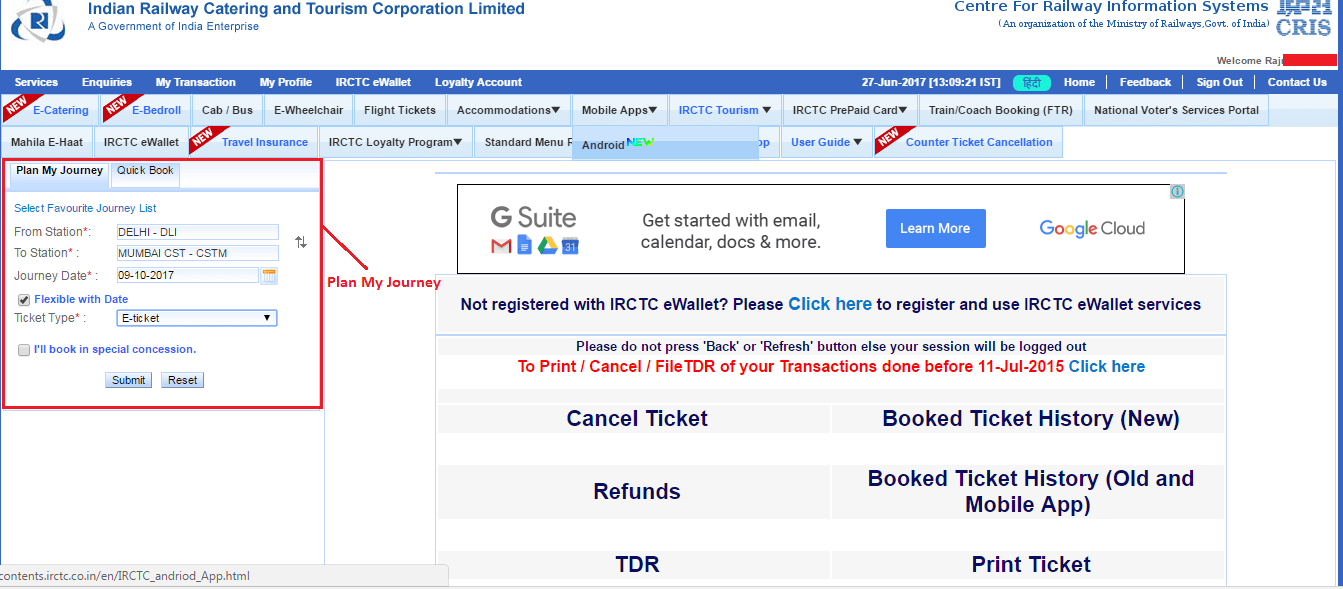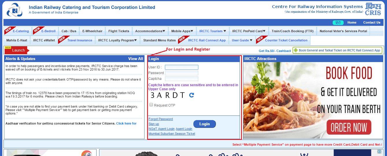 - Visit IRCTC and log into the site. If you are new member, it will request you to sign up.