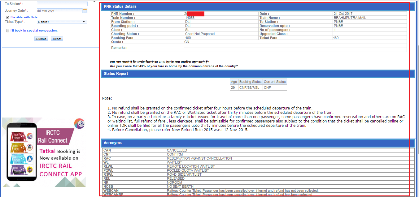 You will be provided with a 10-digit PNR number. Visit IRCTC website and click on PNR enquiry button. Enter your PNR number to check the status of your ticket. You can get details about whether your ticket is in WL or RAC or confirmed. A few hours in prior to the departure time, you can get details about the berth and seat number.