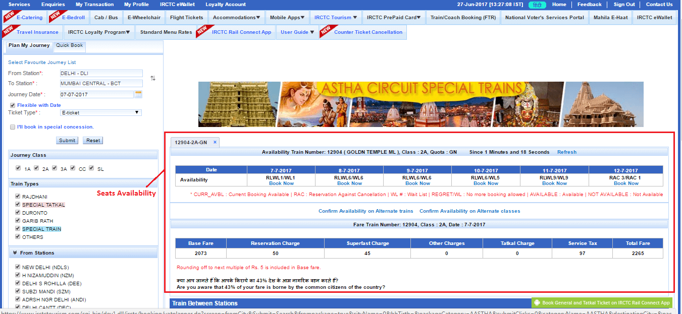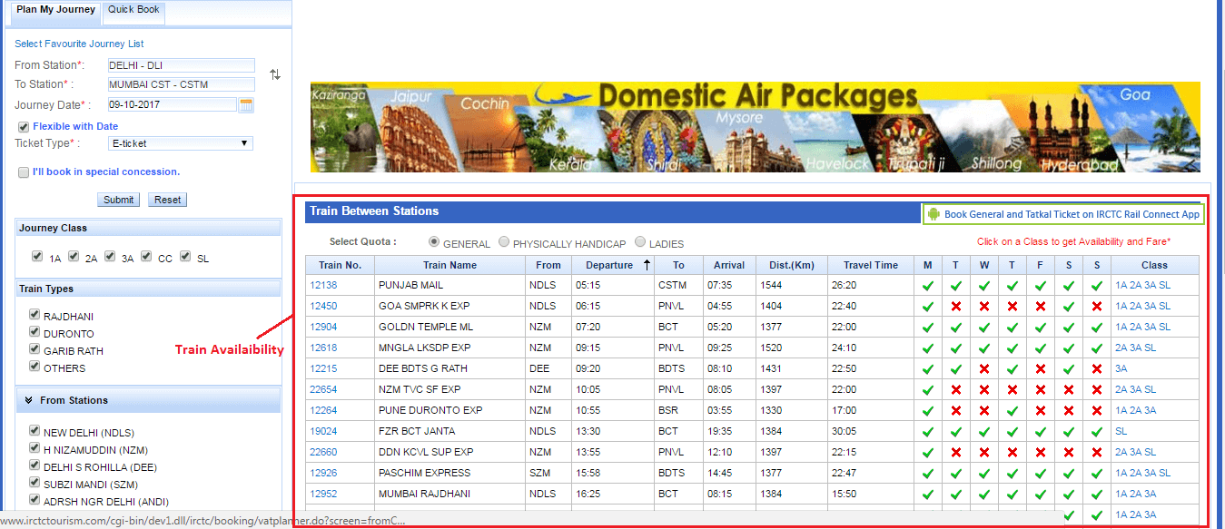 Once you log into the site, there will be tab named ‘Plan My Journey’. Enter the details of the station of departure and station of arrival. You will have to enter details like the class of ticket you are preferring, journey date and others. Select the option for e-ticket. Keep the class and type of train open to find availability during tourism season and festival times.