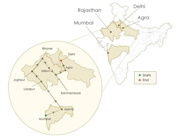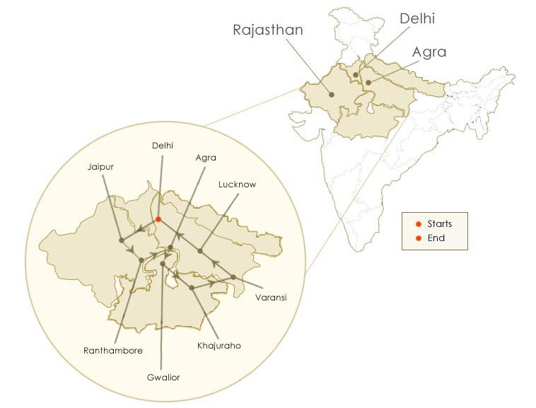 The trip starts at Delhi and makes a round trip back to Delhi. The first stop is at Jaipur, the city buzzing with activities and captivates the guests through a vivid blend of culture, history and modern lifestyle. The next stop is to explore the wildlife, particularly tigers of the Ranthambore national park. The next two stops – Fatehpur Sikri and Agra – are world heritage sites and guests will be overwhelmed at the beauty of the monuments and architectural marvels at both these places.
